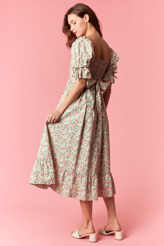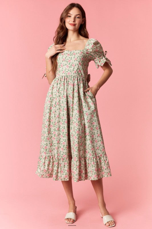 FLORAL PRINTED PUFF SLEEVE WITH BOW TIE DETAILED FLARE MIDI DRESS